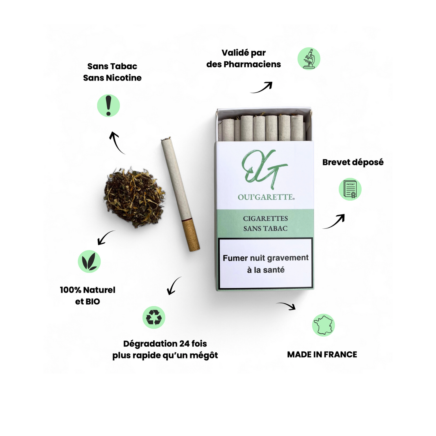 Une Oui’garette a une composition 100% naturelle et BIO composée de plantes médicinales non traitées, à la différence des cigarettes classiques contenant du tabac. Le tabac est traité avec plein de produits chimiques très nocifs libérant quantité de métaux lourds et d'autres substances dangereuses pour la santé lors de la combustion.